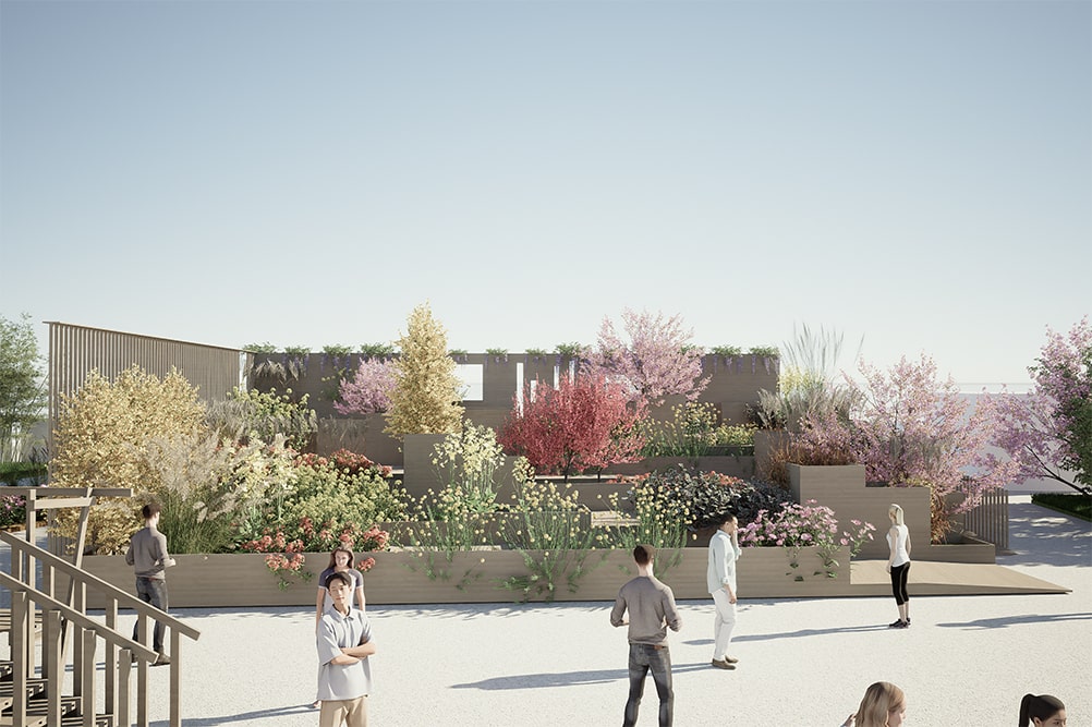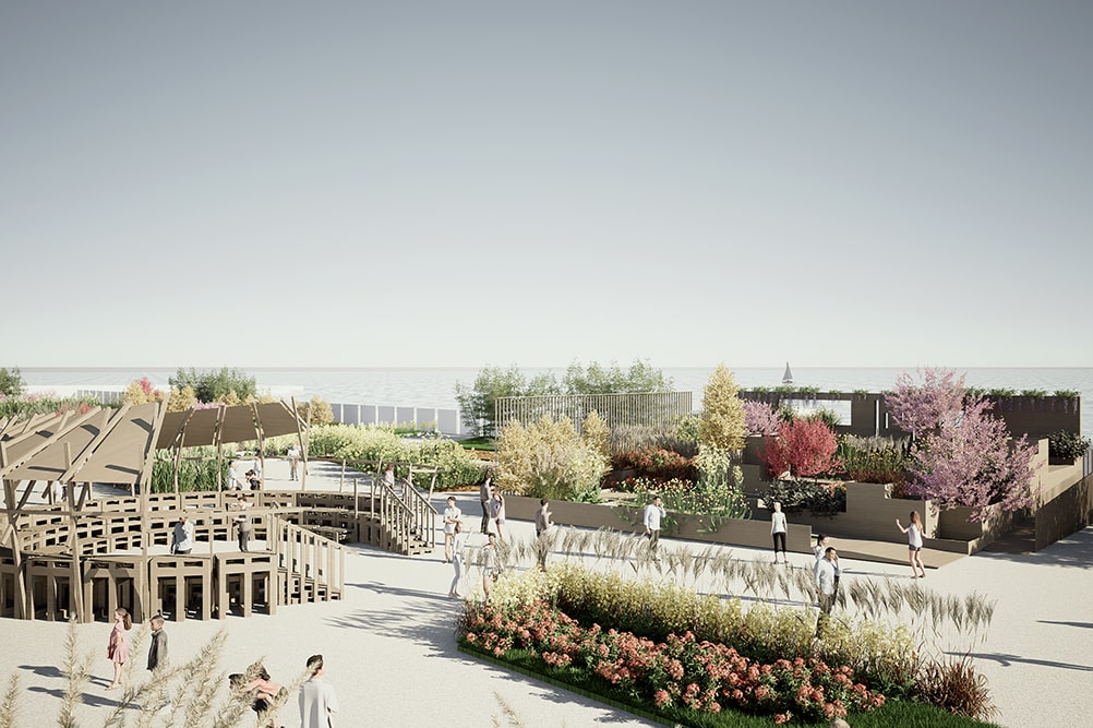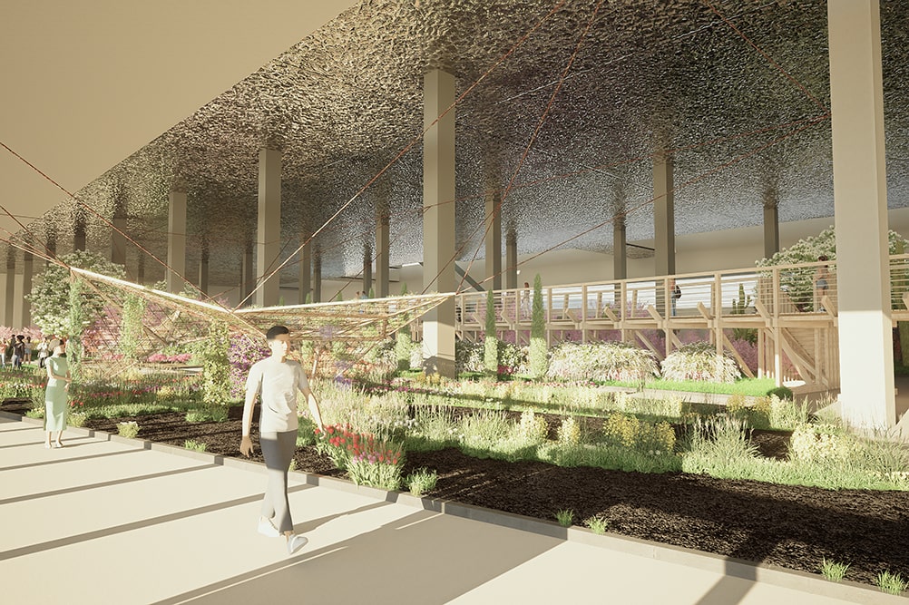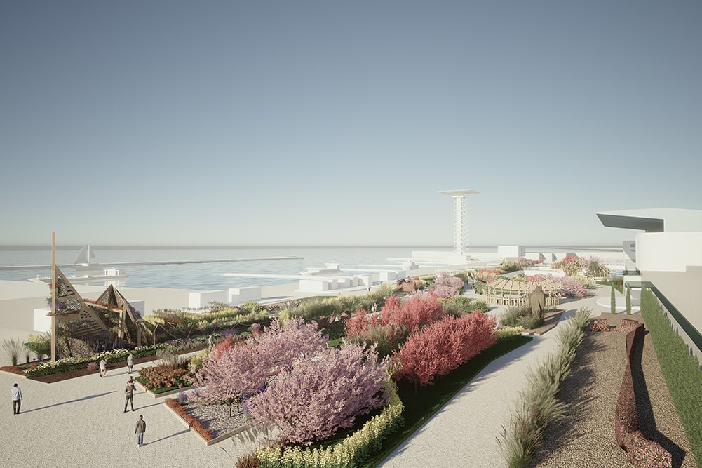 Un “mirador fiorito” affacciato sul mare in Piazzale Kennedy e un ponte pedonale lungo più di cento metri nel padiglione Jean Nouvel permetteranno al visitatore di alzarsi rispetto al livello del suolo e di godere di una vista d’insieme della manifestazione e di tutti gli allestimenti.